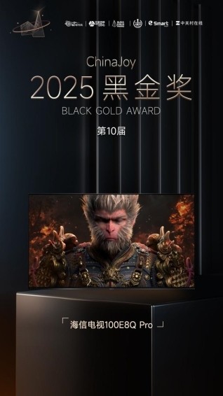 在2025年第10届ChinaJoy黑金娱乐硬件奖(Black Gold AWARD,简称黑金奖)评选中,作为《黑神话:悟空》官方定制电视的海信电视E8Q Pro脱颖而出,凭借“巅峰画质 影游旗舰”成功斩获2025年ChinaJoy黑金奖。