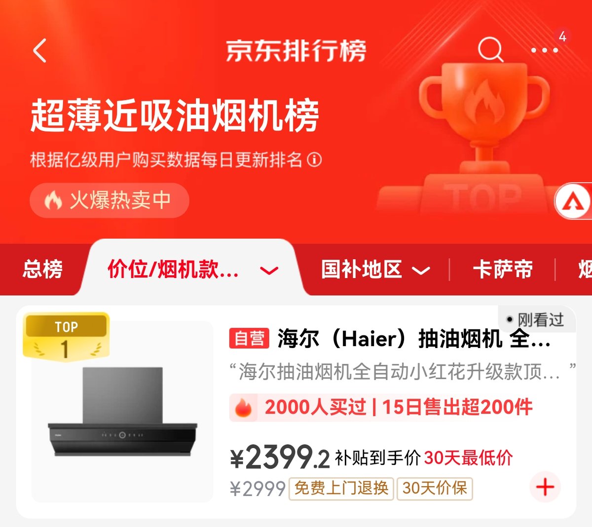 而最近在京东家电实时更新的超薄近吸油烟机排行榜上,一款全自动吸油烟机登顶TOP1,这款由海尔推出的全自动油烟机精准切中年轻用户“怕麻烦”、“要效果”的核心需求。其内置的高灵敏度光学传感器,能够实时监测锅具上方产生的油烟浓度变化,无需用户任何手动干预,烟机即可在油烟升腾的瞬间自动开启,并精准匹配所需的最佳风量。
