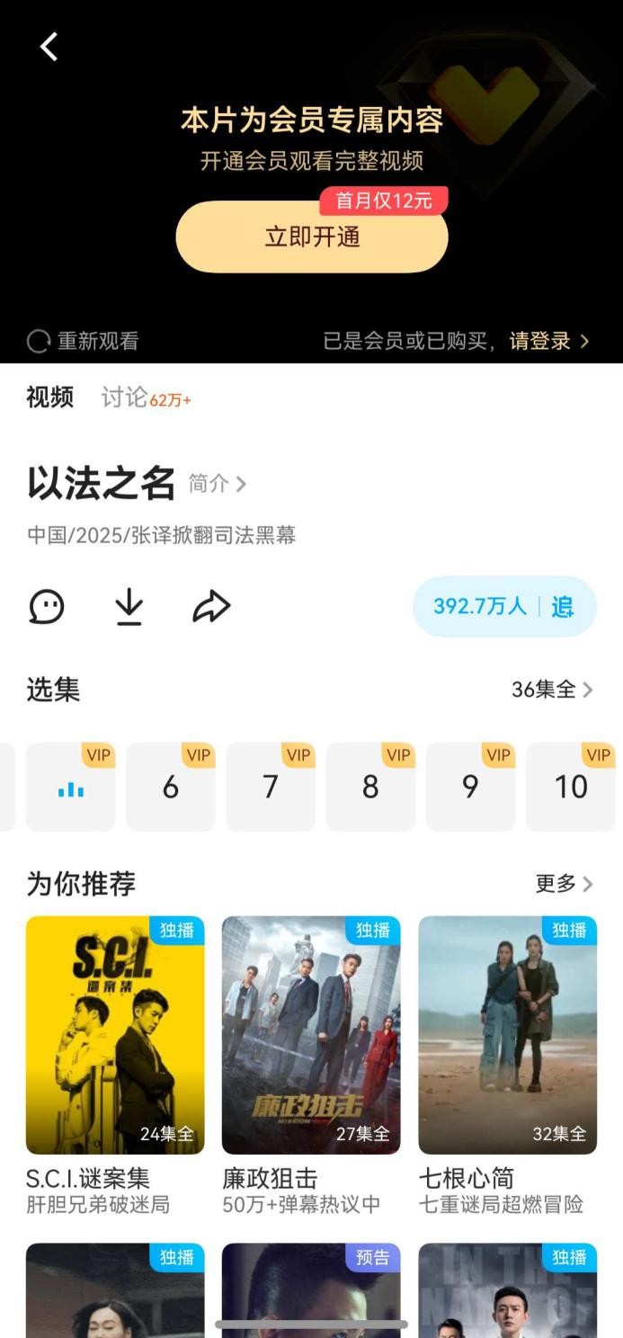 但这种简单追求,也常常被糟糕的观影体验破坏。前阵子我在优酷上追那部超火的电视剧《以法之名》,正看得如痴如醉呢,结果一到第五集,就被会员资格这道“拦路虎”给拦住了,想要观看完整视频只能开通会员,追剧体验太受限了!