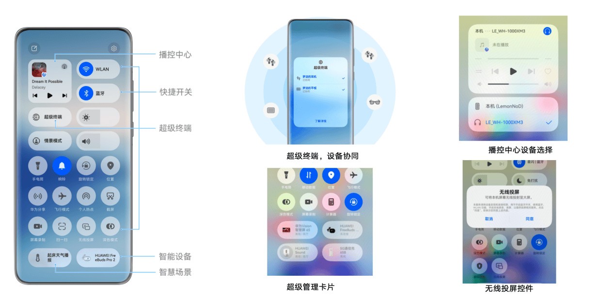 作为全场景协同的核心枢纽,控制中心全面强化跨设备协同能力。用户可通过超级终端、播控中心、多设备场景卡片等功能模块,便捷调用手机、耳机、平板、PC和智慧屏等多种终端设备能力,实现无缝流转与一体化控制,打造连贯高效的互联体验。