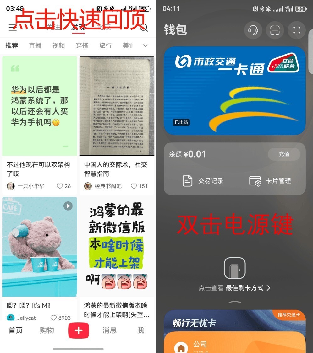 日常操作中查找内容往往令人困扰,鸿蒙5通过提升触控精度,让点击成为高效操作的基础。在微信应用中,轻点界面顶部即可快速回到对话框顶端,未读信息一目了然,省去反复滑动;浏览图库时,轻点顶部立即跳至最新照片,简化检索流程。通勤场景中,双击电源键即可调出乘车卡,实现一扫通过,解放双手让出行更从容。