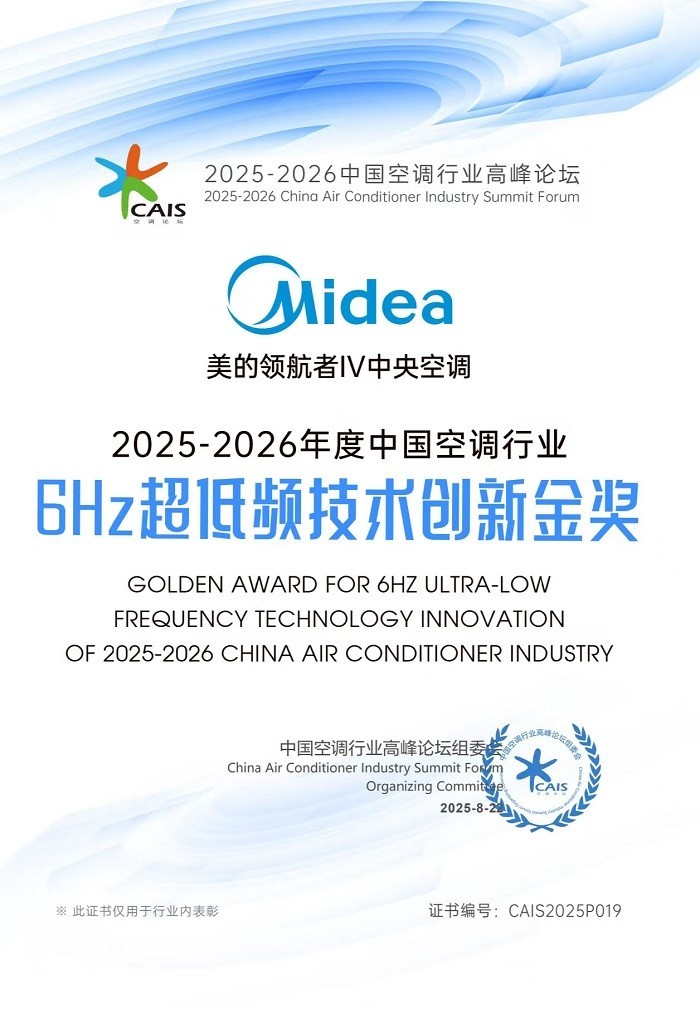 在近日举行的2025-2026中国空调行业高峰论坛上,美的空调不仅荣获"年度创新引领者"称号,更有4款产品同时获奖。其中,美的领航者Ⅳ中央空调凭借核心技术"6赫兹超低频技术"摘得"6赫兹超低频技术创新金奖"。