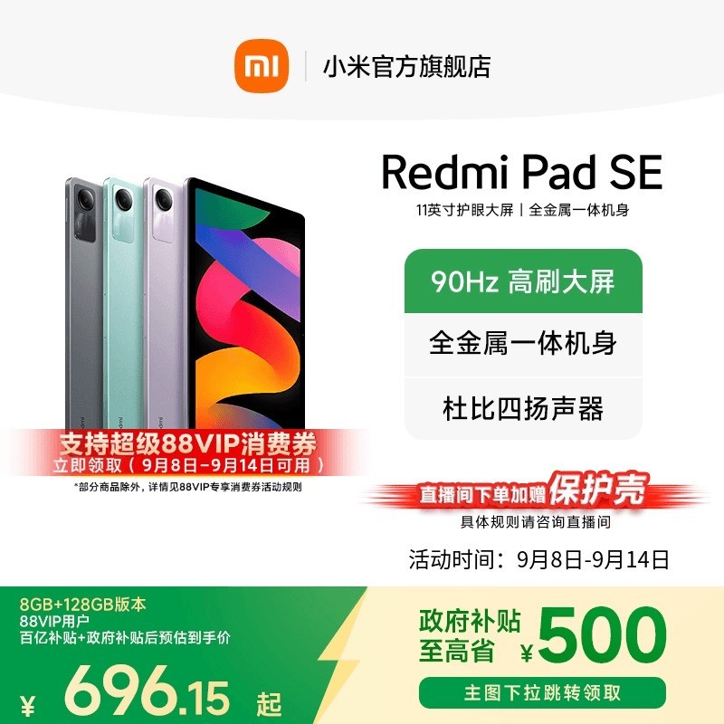 小米红米 Pad SE 11英寸平板电脑,作为入门级产品,主打“千元品质标杆”,外观设计精致,拥有深灰色、星河紫等多种配色,采用全金属一体化机身设计,铝合金一体冲压成型,整机无断点,7.36mm超薄机身,重量仅478g,便携轻盈。搭载骁龙 680 处理器,配备6GB+128GB存储组合,性能稳定,满足日常学习、工作与娱乐需求。配备一块11英寸90Hz高刷屏,分辨率高达12001920,峰值亮度400nits,支持1670万色显示,德国莱茵低蓝光和无频闪双重护眼认证,带来舒适视觉体验。内置8000mAh大电池,续航持久,官方宣称超长待机可达73.2天。后置800万像素主摄,前置500万像素自拍镜头,支持自动追踪拍摄对象。系统搭载MIUI for Pad,支持分屏、迷你小窗、Top 200应用横屏适配,操作更高效,还支持Redmi全新涂鸦触控笔(需另购),提升使用便捷性。