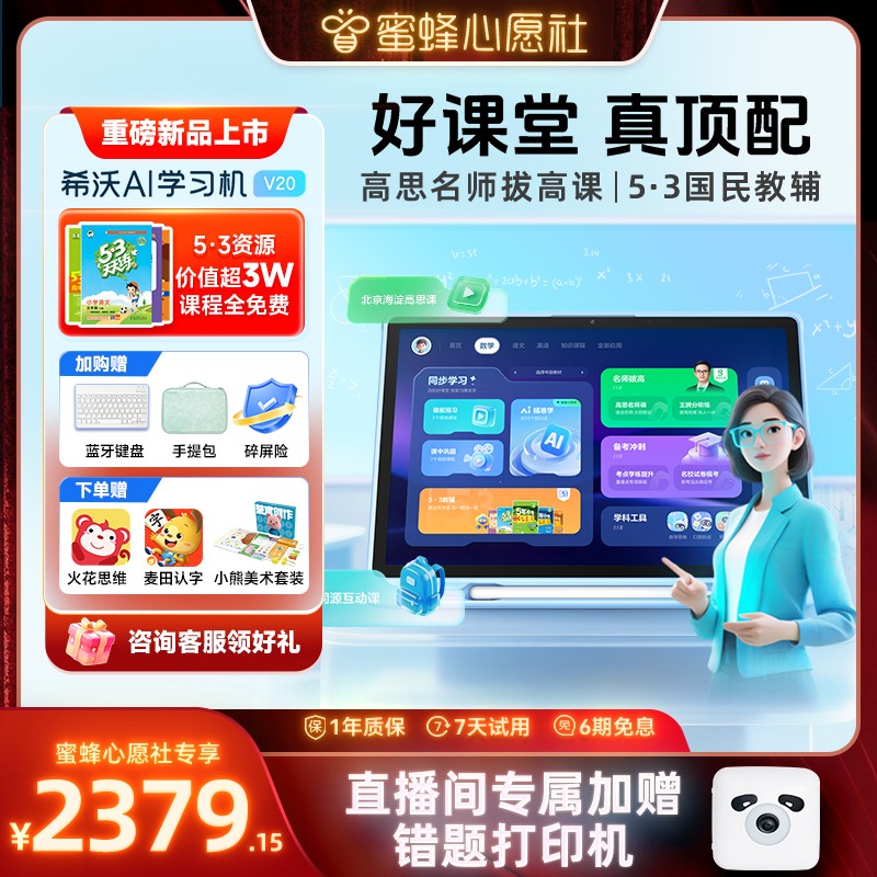 希沃AI学习机V20是专为幼小衔接至高中阶段学生打造的智能学习平板,2025年新款升级配置,性能更强更流畅,满足孩子全阶段学习需求。采用6GB+128GB大内存组合,运行速度快,存储空间足,轻松下载各类学习资料和应用。屏幕支持护眼模式,有效减少蓝光伤害,保护孩子视力健康。内置丰富优质学习资源,覆盖小学、初中、高中各学科,结合AI智能辅导,帮助孩子查漏补缺、提升成绩。官方标配功能齐全,品质保障,助力高效学习。