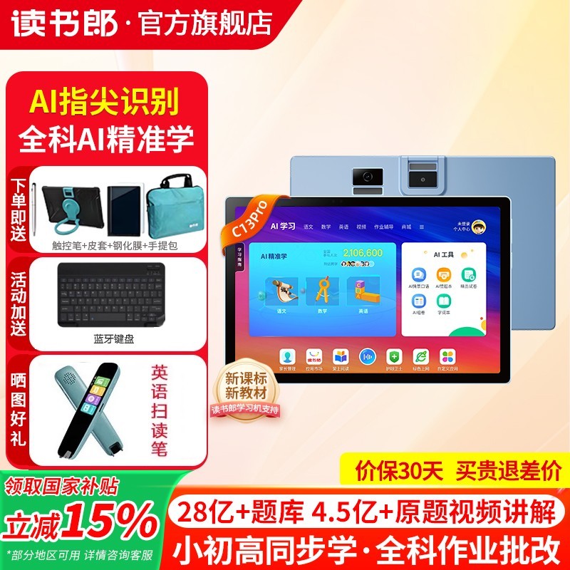 读书郎C13pro学习机是一款学生平板电脑,具备AI智能功能,是小学一年级到六年级以及初中、高中学生的英语家教好帮手。这款学习机颜色分类为C13pro 8(+4GB扩展内存)+256G,内存容量达256GB,采用官方标配套餐。