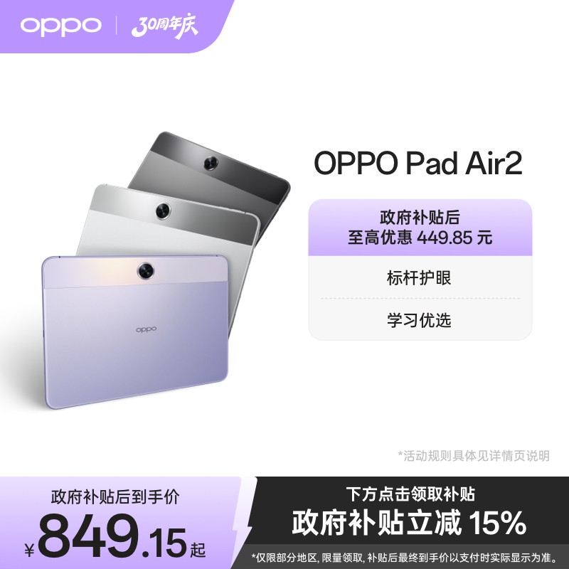 OPPO Pad Air2 11.4英寸平板电脑限时优惠来袭,原价999.00元,现使用国家补贴享8.5折优惠,直降149.85元,最终到手价仅需849.15元,性价比爆棚,喜欢的朋友千万别错过!这款平板提供深空灰与流光银两款经典配色,颜值出众,机身轻薄便于携带。搭载11.4英寸7:5黄金仿书比例大屏,分辨率高达24081720,支持90Hz高刷新率,画面流畅清晰,阅读观影更舒适。屏幕通过莱茵全局护眼认证和节律友好认证,具备低蓝光背光和智能色温调节功能,能根据作息自动调节色温,长时间使用也更护眼。性能方面搭载MTK Helio G99芯片,运行稳定,满足日常学习娱乐多场景需求。特别优化学习体验,新增“学习空间独立密码”和“父母账号”功能,支持锁屏直达学习界面,内置200+精选学习APP,覆盖全学龄段课程资源。配备8000mAh大容量电池,支持33W SUPERVOOC闪充,续航持久充电迅速。音效方面采用新一代超大腔体全频扬声器,8.0cc超大音腔,带来沉浸式立体声体验。搭载ColorOS系统,支持网络共享、文件任意门、高效任务栏、文件随心开及全屏手势等智慧功能,操作更高效便捷。无论是孩子学习还是成人办公,OPPO Pad Air2都是理想之选,现在入手只要849.15元,机会难得,速来抢购!