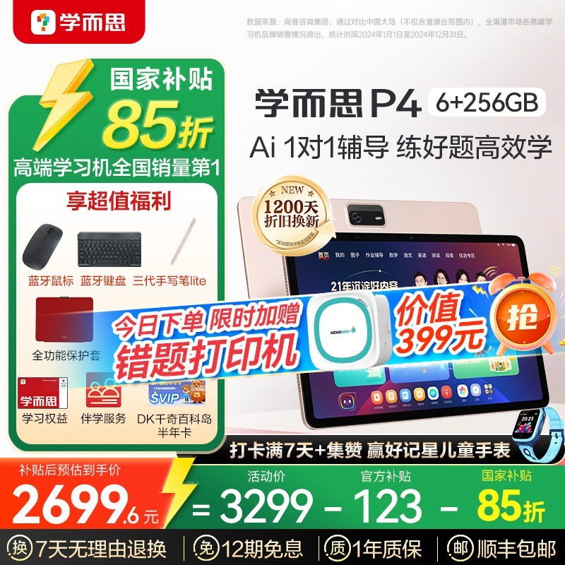 现代教育出版社和学而思联合推出的2025新款学习机P4来啦!它适合小学、初中、高中通用,是一款智能AI辅导大屏护眼学生平板,具备学练一体功能,非常适合孩子进行英语等学科的学习。这款学习机颜色分类有学习机P4—6+256GB,内存容量达256GB,为学习资料存储提供充足空间。