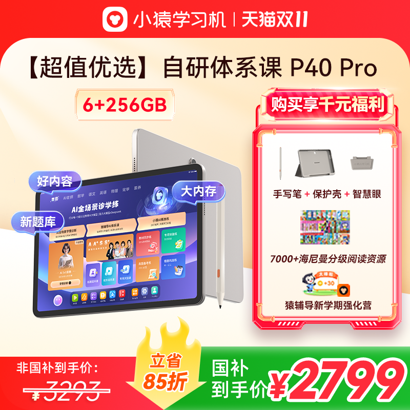 小猿P40Pro猿辅导AI学习机25年全新上市专为儿童及小学初中高中学生打造搭载自研体系课程大屏设计更护眼助力高效学习128GB超大内存畅快运行内置海尼曼分级阅读资源全面提升英语能力这款学习平板不仅内容丰富还支持AI智能辅导精准查漏补缺帮助孩子稳步提升成绩现在购买享超值优惠原价3699元限时立减705元再叠加满1000减100元优惠券还能享受国家补贴8.5折优惠直降478.94元最终到手价仅需2714元性价比超高赶紧入手让孩子赢在起跑线