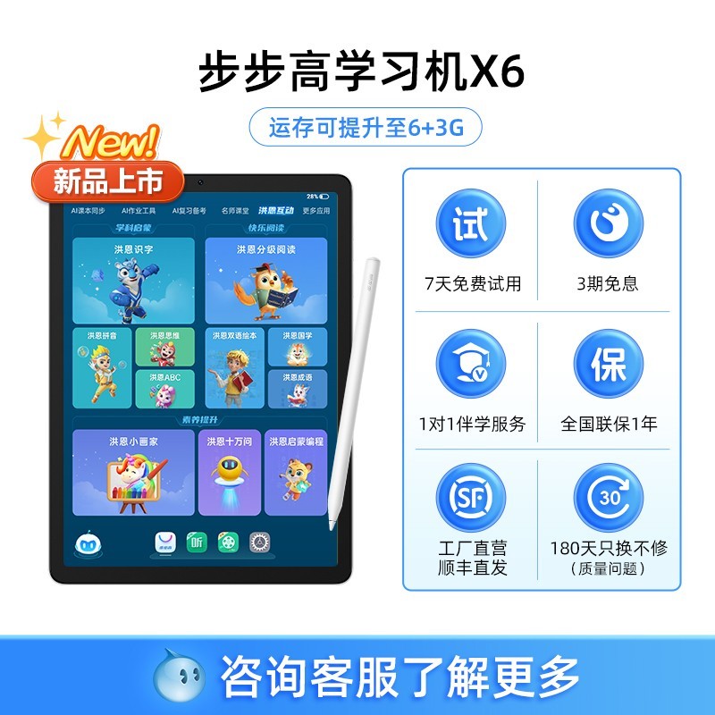 步步高学习机X6早教洪恩儿童AI智能学习平板,专为幼儿园至小学初中高中全阶段孩子设计,2025新款至尊版重磅升级,搭载智能AI系统,内置洪恩教育资源,课程同步教材覆盖语数外理化生等全学科,支持智能辅导、作业帮拍、错题归纳和学情分析,助力孩子高效自主学习。护眼大屏搭配坐姿提醒功能,关爱视力健康,家长远程管控更安心。
