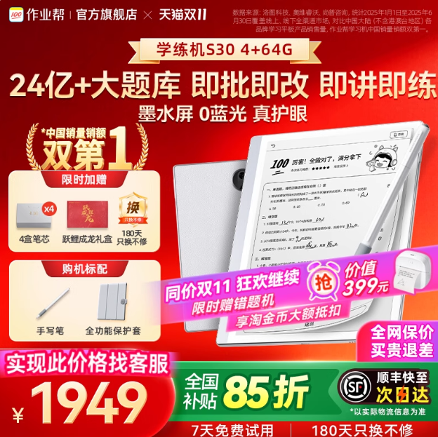 作业帮学练机S30墨水屏护眼学生AI平板小初高通用,专为学生打造的高效学习利器,采用类纸感墨水屏,有效护眼防疲劳,长时间学习更舒适。内置覆盖全国329个教材版本的校内同步练内容,精准匹配教学进度,支持小初高全学科知识点系统训练。拥有24亿+免费题库和700万套真题试卷资源,真正做到学练一体,AI智能批改、错题自动归纳,助力孩子查漏补缺快速提分。
