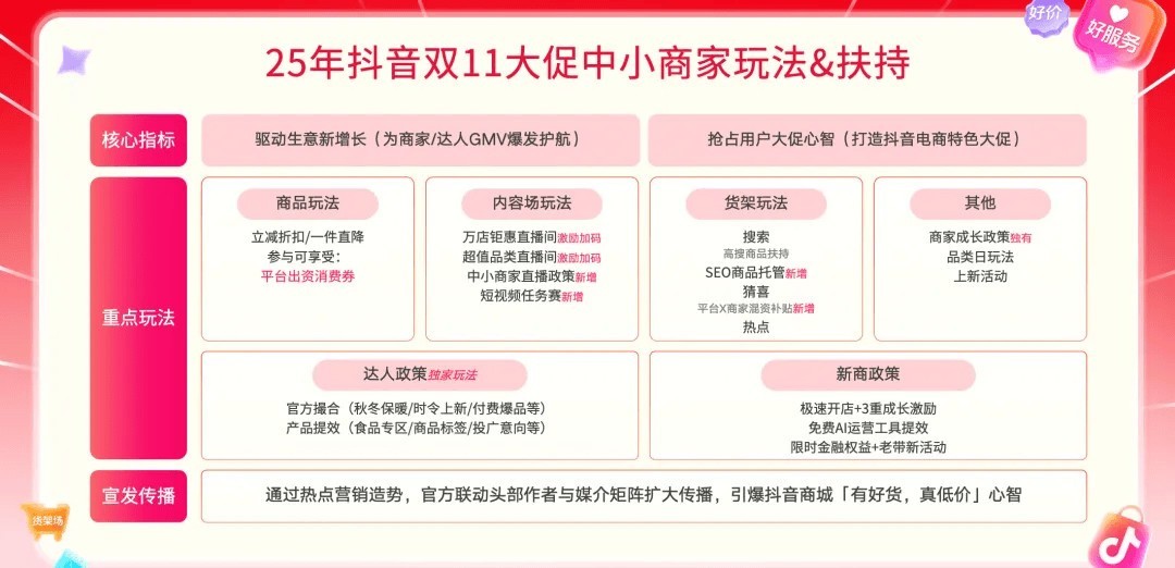 一方面是降低门槛和经营成本,免佣、降费、现金补贴、物流保障等政策投入,持续优化商家交易流程,同时针对新商家推出了“极速开店成长激励、免费AI运营工具提效、限时金融权益、老带新活动”等举措,鼓励更多中小商家在抖音起步。另一方面,此次双11抖音电商为中小商家提供了更丰富的营销玩法、全方位的资源扶持以及海量的经营攻略指导,中小商家无需担心不会玩,只要跟上平台节奏、积极参与就有机会获得各类流量和资源扶持。