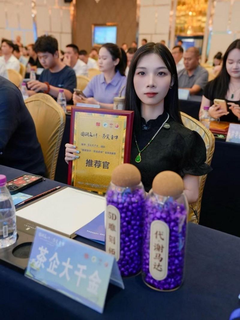 她是传统茶瓷世家的 “摩登继承者”,一袭雅致穿搭衬得翡翠挂件流光溢彩,手中 “推荐官” 牌匾既是家族底蕴的勋章,更是她向Z世代宣战的战旗。懂茶瓷根脉,她能从一泡茶叶、一件瓷器里解码千年文化密码;玩国潮先锋,她用 “5D雕刻版”“黑马.NO1” 的潮范表达,以女性对美与健康的敏锐嗅觉,将茶瓷的养生美学转化为美潮时代女性追捧的变美密码,为女性在 “文化消费 + 自我提升” 的双重需求中,打造出专属的价值入口。