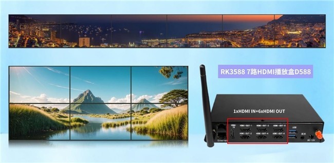 在商业显示、智能会议、工业控制、数字广告等领域,多屏拼接大屏的需求正持续增长,传统多屏方案(比如X86拼接矩阵、多屏显卡、分屏器等)普遍面临一些痛点,X86 拼接矩阵成本高昂且部署周期长、多屏显卡对配置要求高且分屏灵活性不足、普通分屏器仅支持信号复制功能单一等等。因此现在越来越多的客户开始使用低成本且分屏功能强的ARM架构的拼接方案做替代,RK3588 7路HDMI播放盒是定昌电子推出的多屏拼接播放盒。