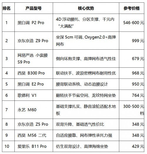 千元内预算应聚焦于腰托自适应能力,如黑白调P2 Pro的4D浮动系统、京造Z9 Pro的五档调节。