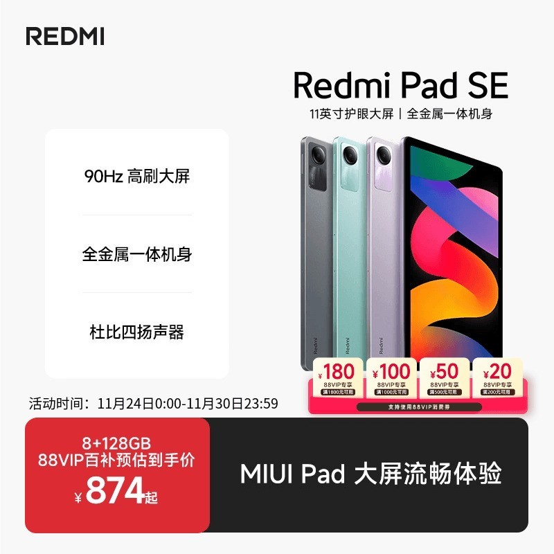 想拥有一款高性价比的平板电脑吗?红米 Pad SE 11.0 英寸 Android 平板电脑不容错过!它定位入门级,主打千元品质标杆,有深灰色、星河紫等三种配色。全金属一体化机身设计,超窄金属边框,铝合金一体冲压成型机身,整机无断点设计,全金属后背搭配隐藏式天线设计,拿在手上尽显优雅。它薄至 7.36mm,轻至 478g,小巧便携无负担。搭载骁龙 680 处理器,内部配备 8000mAh 长循环大电池,官方宣称超长待机可达 73.2 天,支持 18W 充电(标配 10W 充电器)。后置 800 万像素主摄(f / 2.0 光圈),正面配备 500 万像素(f / 2.2 光圈)自拍镜头,支持自动跟踪拍摄对象。正面 11 英寸 12001920 分辨率 LCD 屏,峰值亮度 400 nits,支持 90Hz 刷新率,支持 1670 万色显示,对比度 1500:1,拥有 70% NTSC 色域覆盖率,屏占比 84.4%,还获得德国莱茵低蓝光 / 无频闪双重护眼认证。系统搭载 MIUI Pad 系统,支持分屏浏览、迷你小窗,Top 200 应用深度横屏适配,还支持 Redmi 全新涂鸦触控笔,笔身为金属材质,采用被动电容原理,无需充电,电容屏都适用。