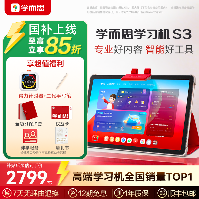 现代教育出版社的学而思学习机S3是一款智能AI辅导神器,是学生儿童的平板家教机,小学、初中、高中通用。它拥有大屏护眼功能,是学练一体的好帮手。这款学习机颜色为学而思学习机S3,内存容量达256GB,采用官方标配套餐。