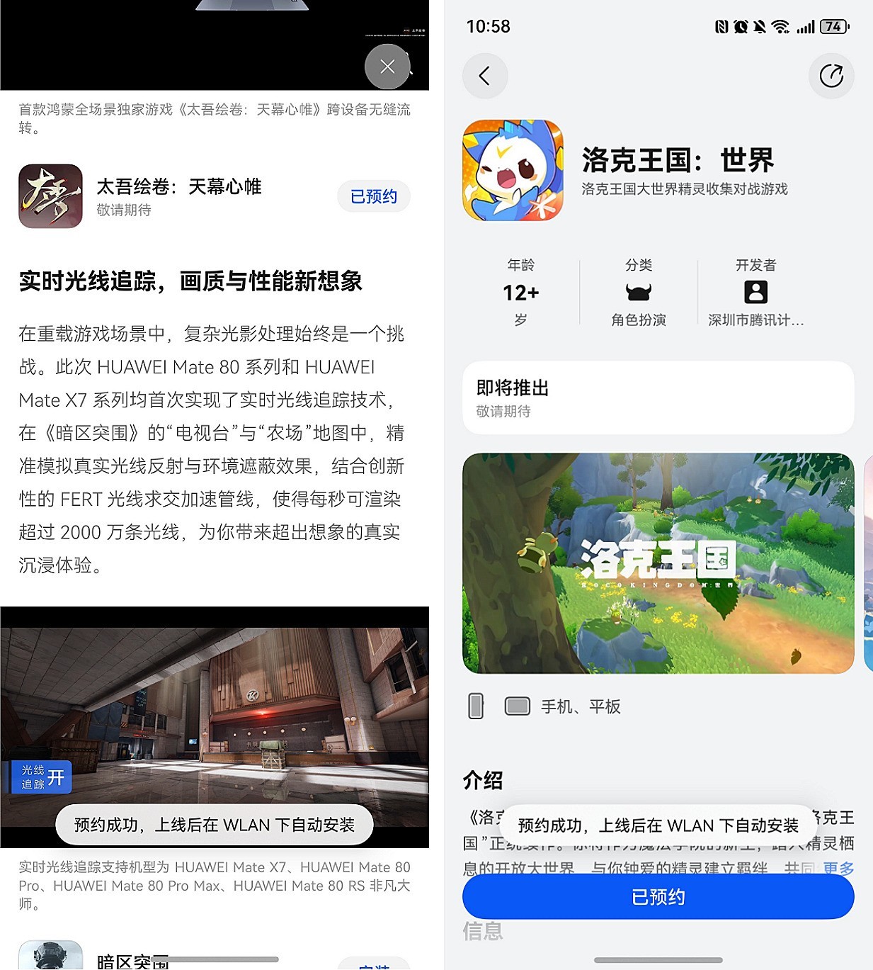 目前,鸿蒙应用市场已为多款热门内容开放预约通道。其中包括即将上线的《太吾绘卷:天幕心帷》与《洛克王国:世界》 等备受期待的新作。不管你偏爱武侠江湖的沉浸式剧情,还是喜欢热血刺激的格斗竞技,均可通过该功能提前锁定感兴趣的内容。预约成功后,可以在内容上线第一时间体验鸿蒙专属优化版本——这些游戏适配了鸿蒙系统特性,帧率更稳定、功耗更可控,跨设备切换时还能无缝接续进度,体验感直接拉满。