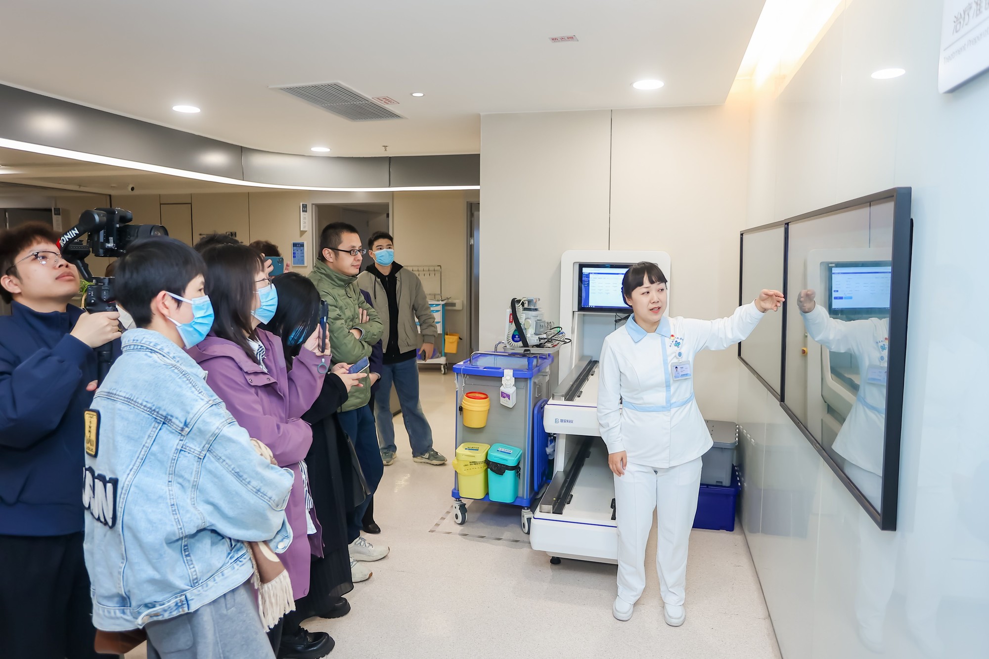 图为重庆两江新区人民医院新院区智慧病房的医护人员在介绍大屏上的实时数据。资料图片