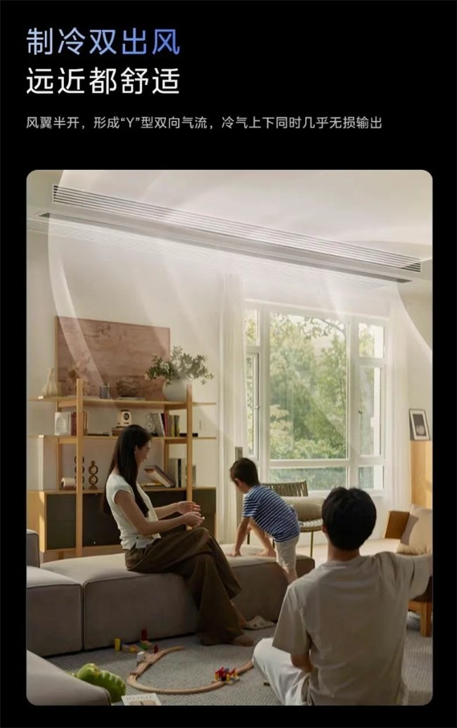 美的双出风中央空调采用创新式双翼变轨控风技术,支持制冷/制热多模式出风,具备远距离送风、精准温控、隐形式定制化风口设计等特点,融合智能控制与节能技术,适用于家庭客厅及大空间场景。