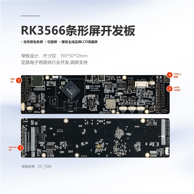RK3566条屏开发板是定昌推出的主板,定昌DC_T566是基于RK3566主控芯片自主研发的一款超窄条形的商显开发板,将针对条形屏,货架屏,切割屏等商用显示条形屏行业提供开发与调屏技术支持,兼容多种尺寸及分辨率的LCD条屏,如:23.1寸,24寸,35寸,35.6寸,47.1寸,47.8寸等1080P,4K屏,在智能零售,公交地铁等业务场景上拥有出色的4K超清显示呈现。