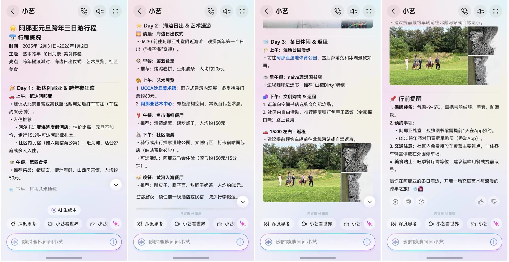 出行的幸福感,往往始于一场高效省心的行前规划。面对元旦期间纷繁复杂的旅游信息,不少人会陷入“选择困难”,而鸿蒙6加持下的小艺则成为决策的“智能脑”。只需一句“帮我规划去阿那亚跨年的元旦行程”,小艺便能理解复杂意图,整合景点、酒店、美食、天气、人流预警等信息,生成图文并茂的定制方案,并支持一键跳转至预订或导航页面。