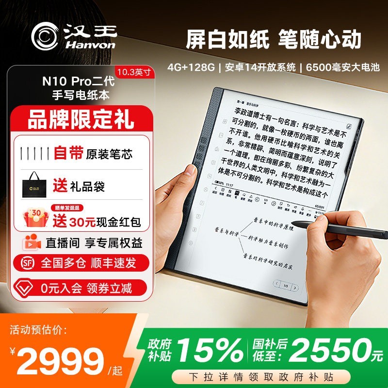 汉王N10 Pro二代10.3英寸墨水屏电子书阅读器银色款现正于天猫商城限时促销原价3999元现享多重优惠叠加国家补贴立减296.9元再领满500减30元优惠券最终到手价仅2672.1元性价比出众该阅读器配备10.3英寸大屏还原纸质阅读体验搭配墨水屏技术护眼不伤神支持Wi-Fi连接内置128GB大容量存储畅存万册图书机身轻薄设计手感舒适续航持久是学习办公与日常阅读的理想之选喜欢就趁优惠入手一台吧
