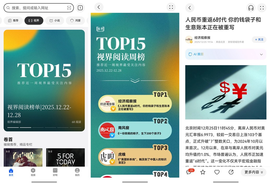 视界频道汇聚时政、科技、文化、财经等多领域内容,资讯均源自行业知名媒体机构与优质创作者,经专业团队严格筛选,确保信息权威性与价值性。频道多维度资讯看点,如每日精选《5 For Today》、值得关注的焦点内容《对焦》、观影指南《看点啥》等,都是深度好内容,在视觉设计上则采用4:5资讯大图比例与杂志级美学排版,搭配十字交互设计,用户可轻松实现上下滑动阅读文章、左右切换内容的无缝浏览,带来沉浸式阅读体验。