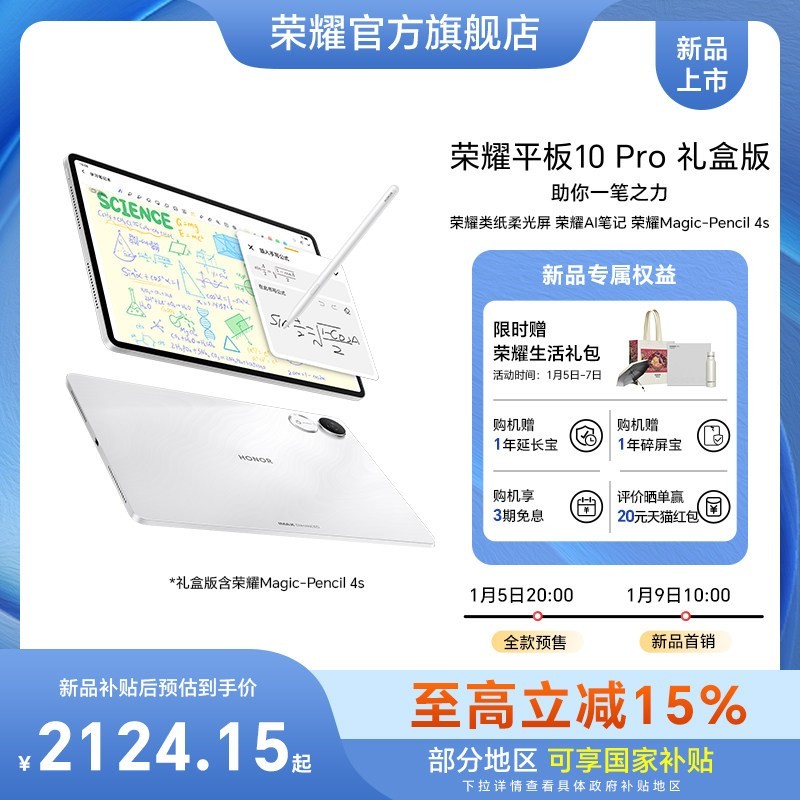 荣耀平板10 Pro礼盒版震撼来袭,专为办公与学习打造的高效利器!搭载荣耀独家类纸柔光屏,有效降低屏幕反光,长时间阅读书写更护眼,带来如纸质般的舒适视觉体验。内置荣耀AI笔记功能,智能识别手写笔迹,支持多格式导出,会议记录、课堂笔记轻松整理。性能强劲运行流畅,无论是处理文档、在线学习还是影音娱乐都能得心应手。