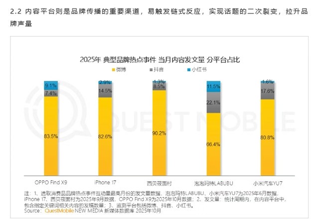 QuestMobile数据显示,在2025年最具代表性的新品发布事件中,微博展现出了显著的“主场效应”。其中,iPhone 17系列发布期间,微博平台贡献了全网82.6%的内容声量;OPPO Find X9系列发布时的微博声量占比高达83.5%;而在备受瞩目的小米汽车YU7发布事件中,微博声量占比同样达到了80.8%。此外,包括西贝莜面村等在内的知名品牌热点事件,其在微博的声量占比甚至超过了90%。