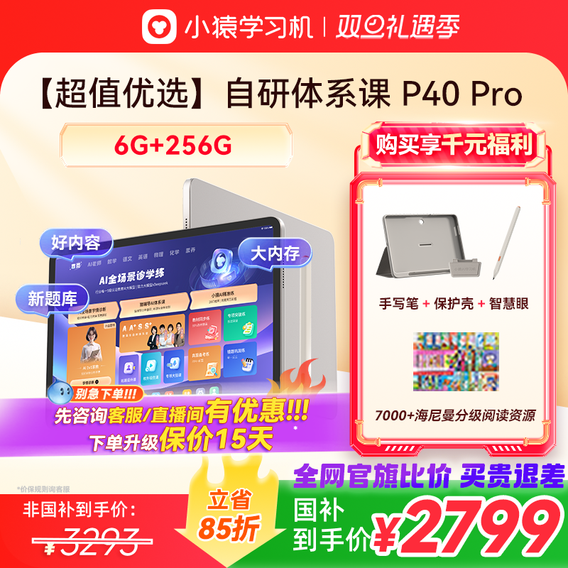 小猿学习机P40Ultra是猿辅导推出的一款AI学习机,适用于小学、初中、高中全学段,它是集学习与练习功能于一体的大屏护眼平板电脑。现在天猫商城这款自研体系课P40Pro规格为6 + 256G的小猿学习机P40Ultra正在搞活动,参加立减684元活动,还能使用在商品详情页领取的满2000元减200元优惠券,原本售价5699元,最终到手价只需3667.94元/件,喜欢的朋友可以入手。