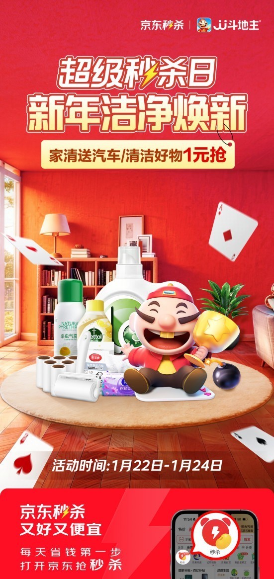 1月22日,来京东APP进入秒杀频道参与活动,1元抢超值好货、抽汽车大奖、囤清洁爆款,用实惠价格解锁全屋焕新,以洁净舒适的居家氛围,迎接春节的到来!