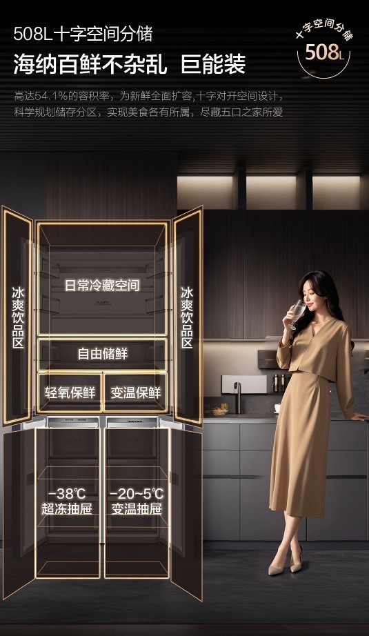 508L大容量配合99L宽幅变温室,支持-20℃~5℃灵活调节,满足母婴家庭多样化存储需求。