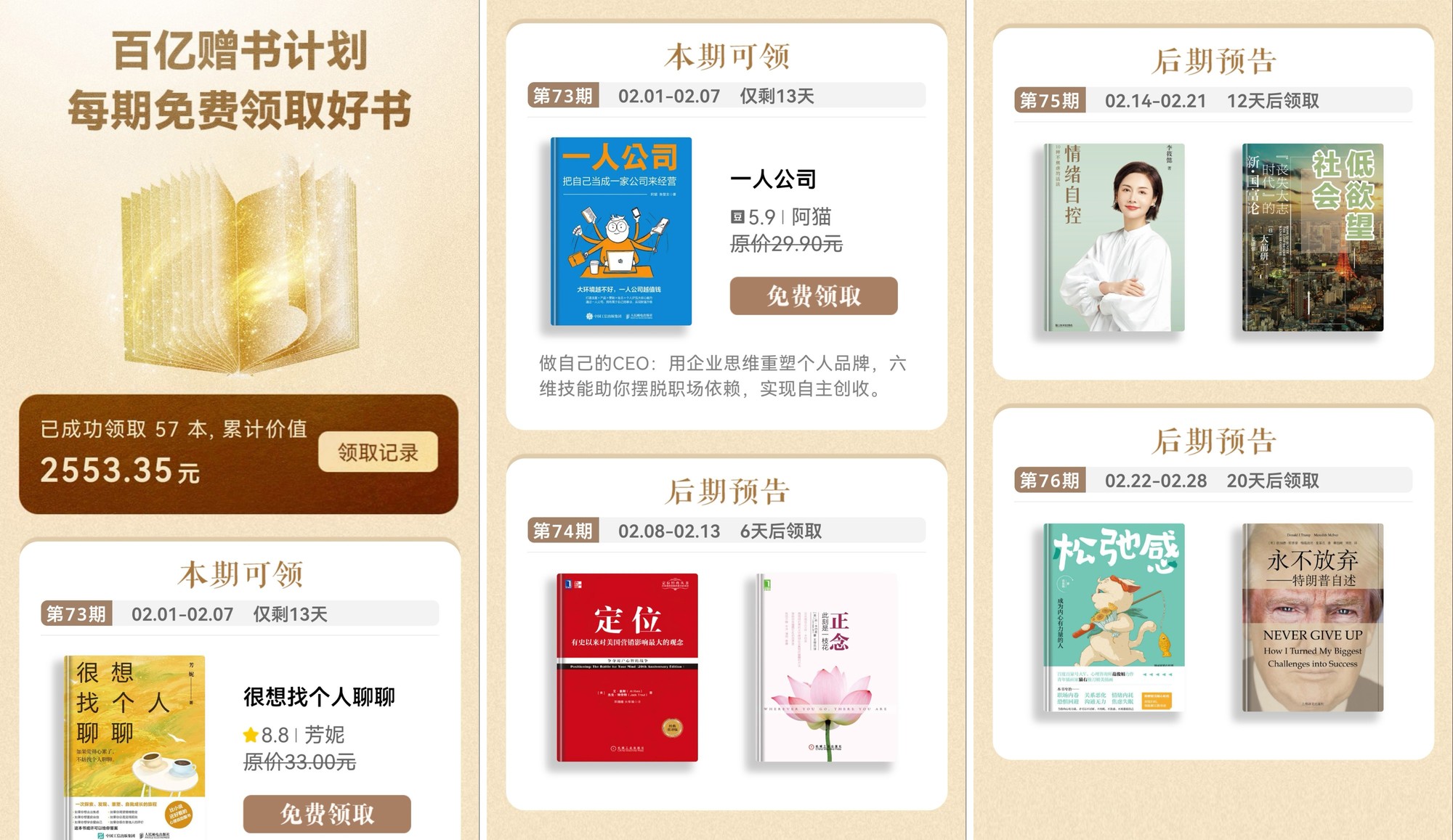 基于这一判断,华为阅读自2023年起推出“百亿赠书计划”,以长期、持续的方式向用户免费开放优质图书资源。这一计划并非一次性促销活动,而是被视为平台层面的长期公共文化投入。华为阅读每周都会精选一批具有思想深度和阅读价值的图书,面向会员免费赠送,希望通过“零门槛”的方式,让更多人走进阅读。从内容结构看,赠书既涵盖文学经典、畅销小说,也包括历史、人文、社会科学等多个领域,强调内容品质与思想价值的平衡。