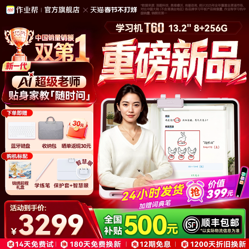 作业帮学习机T50是一款AI智能辅导学习利器,适用于一年级到小学、初中、高中的学生。它拥有大屏护眼平板,能有效呵护孩子眼睛。现在天猫商城有促销活动,有颜色分类为T60(8 + 8/256G)、内存容量256GB的款式参与。