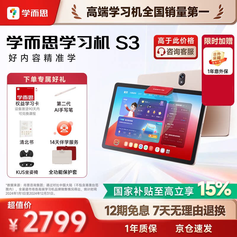 它原价3593元,目前特价至2748.9元,还能领取店铺满2000减359优惠券并叠加国补,最终到手价就是2748.9元。购买后晒图还能返50元,同时还赠送坐姿椅和全功能保护套。学而思学习机S3能助力小初高学生更好地学习,如此好价别错过!