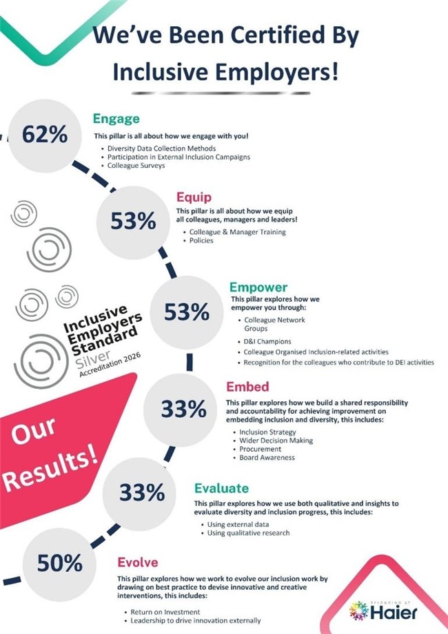 今年2月,海尔英国&爱尔兰在包容性雇主标准评估中获银级认证,两年内实现了从铜级到银级的跨越式进阶,以实际行动印证了其在培育职场文化上的坚定投入与显著成效。
