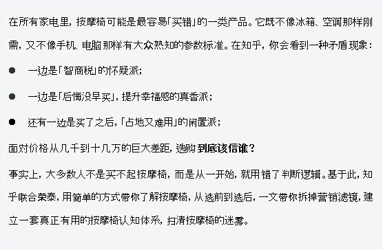 在知乎,有关按摩椅的话题常年处于高热度,从公共空间的「躺平体验」,到放在家中的给自己的「缓冲时刻」,知友们与这把椅子有过各式各样的交集,但归根结底,问题往往集中在「怎么样?怎么选?怎么用?」这三大类之间——