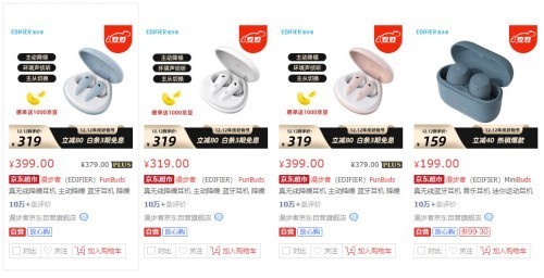 京东双十二,千万不要错过机会,最低价319元即可秒杀这款漫步者(EDIFIER)FunBuds 真无线降噪耳机 。