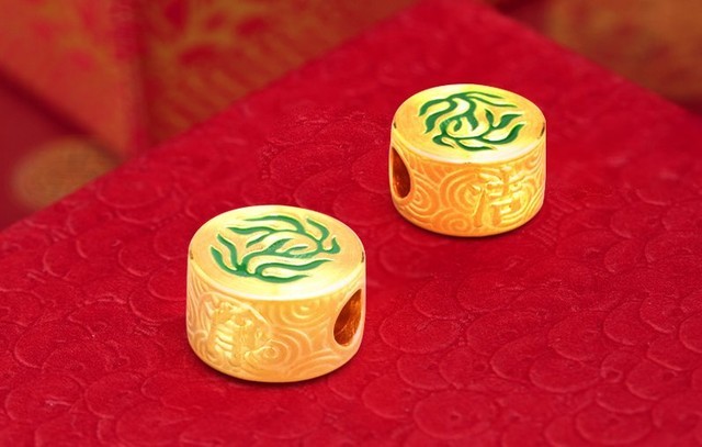 十二章纹珠——洁净,是以故宫馆藏清乾隆的龙袍上十二章纹“藻”为灵感创意而设计,足金999,采用3D硬金工艺,不容易磨损变形。珠子最大的亮点是上面的绿色珐琅藻章,纯净无瑕,珠体印刻“洁净”二字,并辅以水波纹。