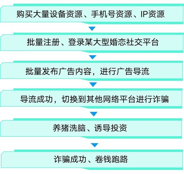通常,“杀猪盘”的主要犯罪路线为:利用猪槽找猪(通过交友工具好友扩列)——投喂猪饲料(按照剧本聊天)——养猪(确定恋爱关系)——杀猪(诈骗)。而在诈骗的背后,是针对各种社交场景制定更为缜密的行为逻辑与黑产产业链。