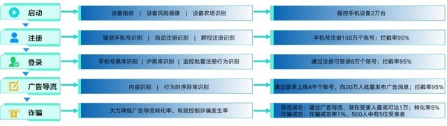 设备启动阶段,数美科技可以利用设备指纹、设备风险画像、设备农场识别多种方法进行风险识别;账号注册阶段,数美科技可以利用手机号黑库、IP黑库、监控批量注册行为进行风险识别;账号登录阶段,数美科技可以对账号进行二次风险识别,防止漏号。