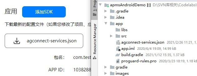 在Android Studio中新建一个Android工程,包名需要和AGC界面上的包名保持一致,然后回到AGC首页,在“我的项目-项目设置-应用”界面下,找到并且将agconnect-services.json文件下载到本地,放到Android工程的app层级目录下。