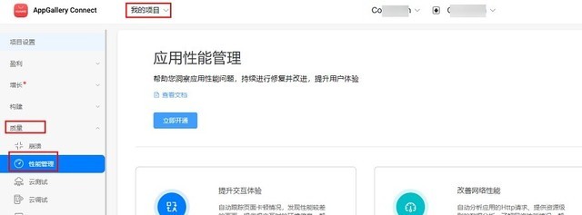 首先,我们在AGC控制台创建应用并开通APM,创建应用的时候,注意应用的包名要和APK里的包名保持一致。如果是在已有的应用里集成APM,注意包名需要和AGC控制台创建应用时配置的包名保持一致 。创建好项目应用后,或者使用已有的应用,在界面上找到“我的项目-质量-性能管理”,点击立即开通即可。