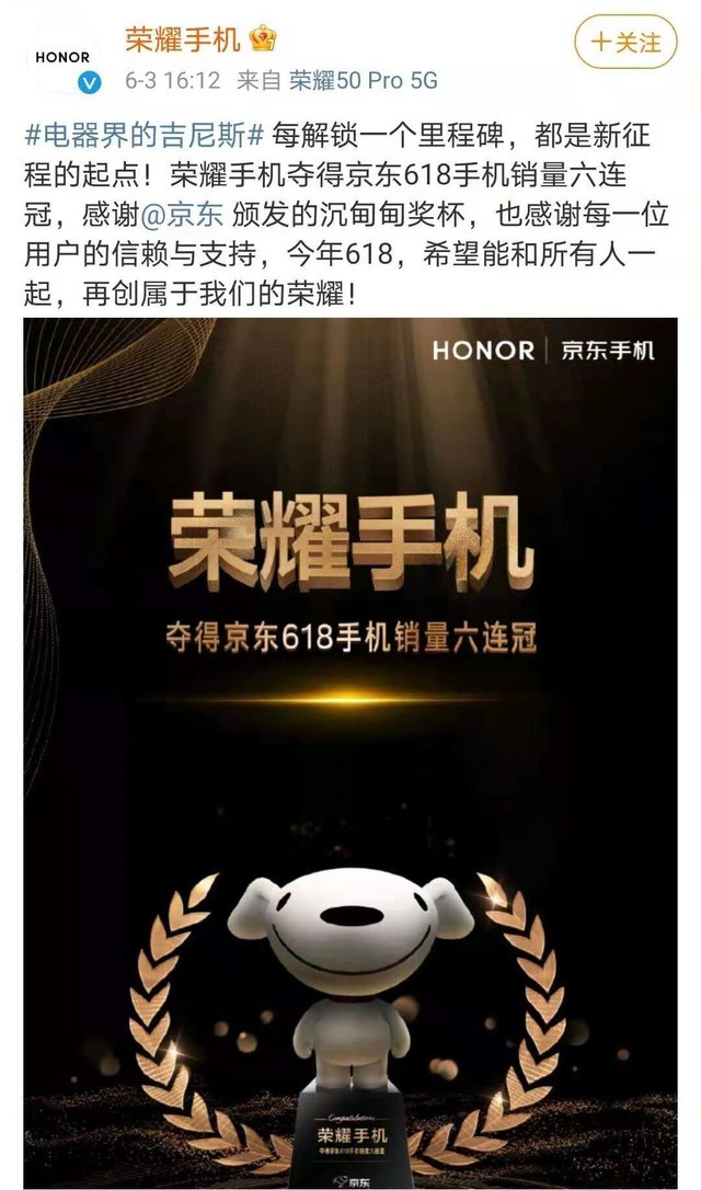 “每解锁一个里程碑,都是新征程的起点……希望能和所有人一起,再创属于我们的荣耀”。今年618,荣耀手机官微推送了一条内容,专门感谢京东为其颁发的“里程碑”奖杯,清晰可见的“荣耀手机夺得京东618手机销量六连冠”背后,也足见消费者们的喜爱与支持。