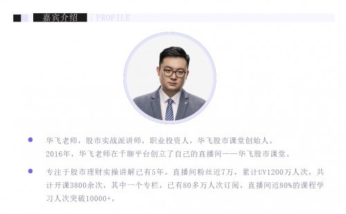 华飞:我的课程体系做得是比较完善的,因为我有这样一个理念,每个学员对于股市的理解是不同的,有一些是新股民,他急需一些基础性的课程;有一些是老股民,是比较有经验的,需要一些实战类的更贴合市场的课程,面向这两种类型学员的课程都要有。