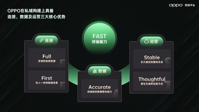 借助OPPO软硬服一体化的全球生态和终端媒体优势,OPPO营销具备全域的资源连接(Full),能先人一步触达用户(First),帮助广告主深度理解用户(Accurate),再通过系统原生无感的运营方式(Thoughtful),与用户建立长久稳定的服务关系(Stable),从而构建起OPPO营销在连接、数据、运营上的三大核心优势。