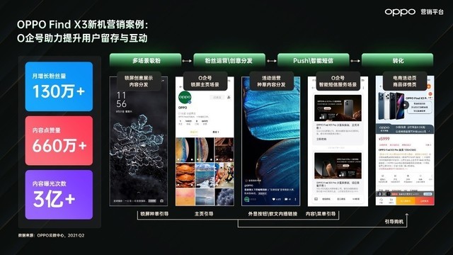 此次OPPO营销专场,Cody还分享了O企号的实际落地案例。如 OPPO Find X3新机营销中,在OPPO终端生态下通过多场景内容分发吸粉,借助OPPO官方O企号粉丝、Push和智能短信进行触达转化,收获了月粉丝增长数量130万+、内容点赞量达660万+、内容曝光次数达3亿+的显著成效。