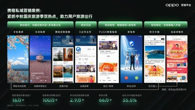 携程在中秋国庆旅游季双热点下借助私域O企号助力用户旅游出行,即通过创意攻略内容定制与手机亮屏乐划锁屏多场景分发,O企号主页实现粉丝沉淀与留存,借助终端独有能力及场景强化粉丝粘性与触达转化,实现了国庆周新增粉丝量16万+、周新增点赞量100万+、粉丝总量66万+、粉丝APP调起率提升35.5%的亮眼成绩。