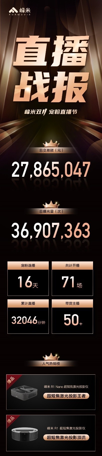 一直以来,激光微投开创者峰米科技(以下简称“峰米”)关注着电商直播赛道的迅猛发展,今年双十一期间,峰米深入布局电商平台,开启“峰米双11宠粉直播节”活动,通过多样的直播模式,包括高层+主播的组合,薇娅、李佳琦、罗永浩等头部主播的轮番推荐,宠粉连播16天,累计开播71场,最终双十一直播总销售额达到27,865,047元,总曝光量达到36,907,363次,优异成绩的证明峰米对用户需求的精准把握,也体现了用户对峰米从品牌到产品品质的信任。