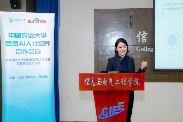 张漫在致辞中提到:“智慧农业是新一代信息技术,与传统农业生物系统深度融合,是现代农业的制高点。对于智慧农业的关键技术,我们总结成五个字叫感、移、云、大、智,即感知、移动互联、云计算、大数据、智慧与智能装备。”同时,对于此次与百度的AI人才培养合作,张漫表示,“AI+农业人才培养意义重大。AI等新一代信息技术赋能传统农业,在智慧种植、智慧养殖、智能农机装备、智慧能源等领域,具有广阔的应用前景,为农业插上智慧的翅膀。百度公司是拥有强大互联网基础的AI领先企业,相信我们和百度公司携手建立人工智能人才培养的实践基地,将会促进我院在人才培养科学研究的工作,不断提升本科生、研究生在AI领域的实践动手能力和科研创新能力。”